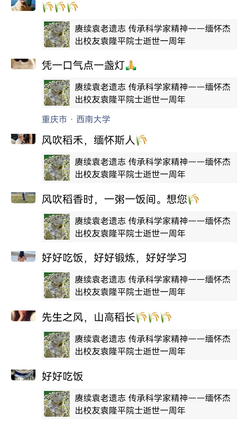 2021522日,共和国勋章获得者、杂交水稻之父中国工程院院士、西南大学杰出校友袁隆平因病医治无效在长沙逝世。