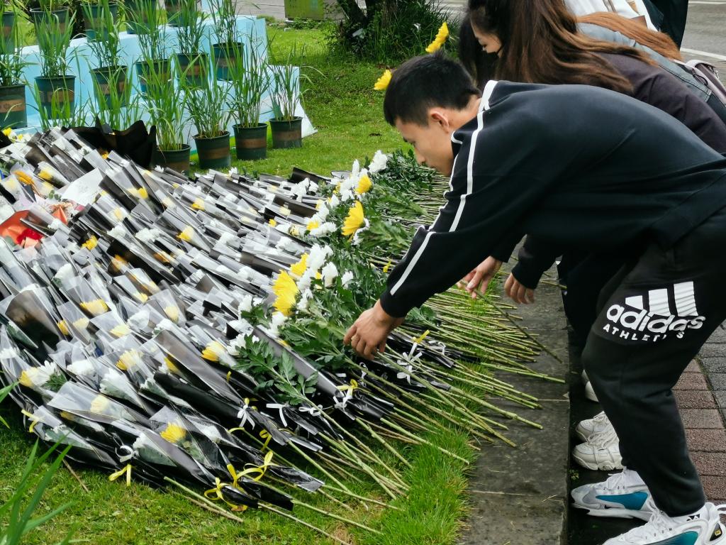 集体献花时,现场一片肃穆。