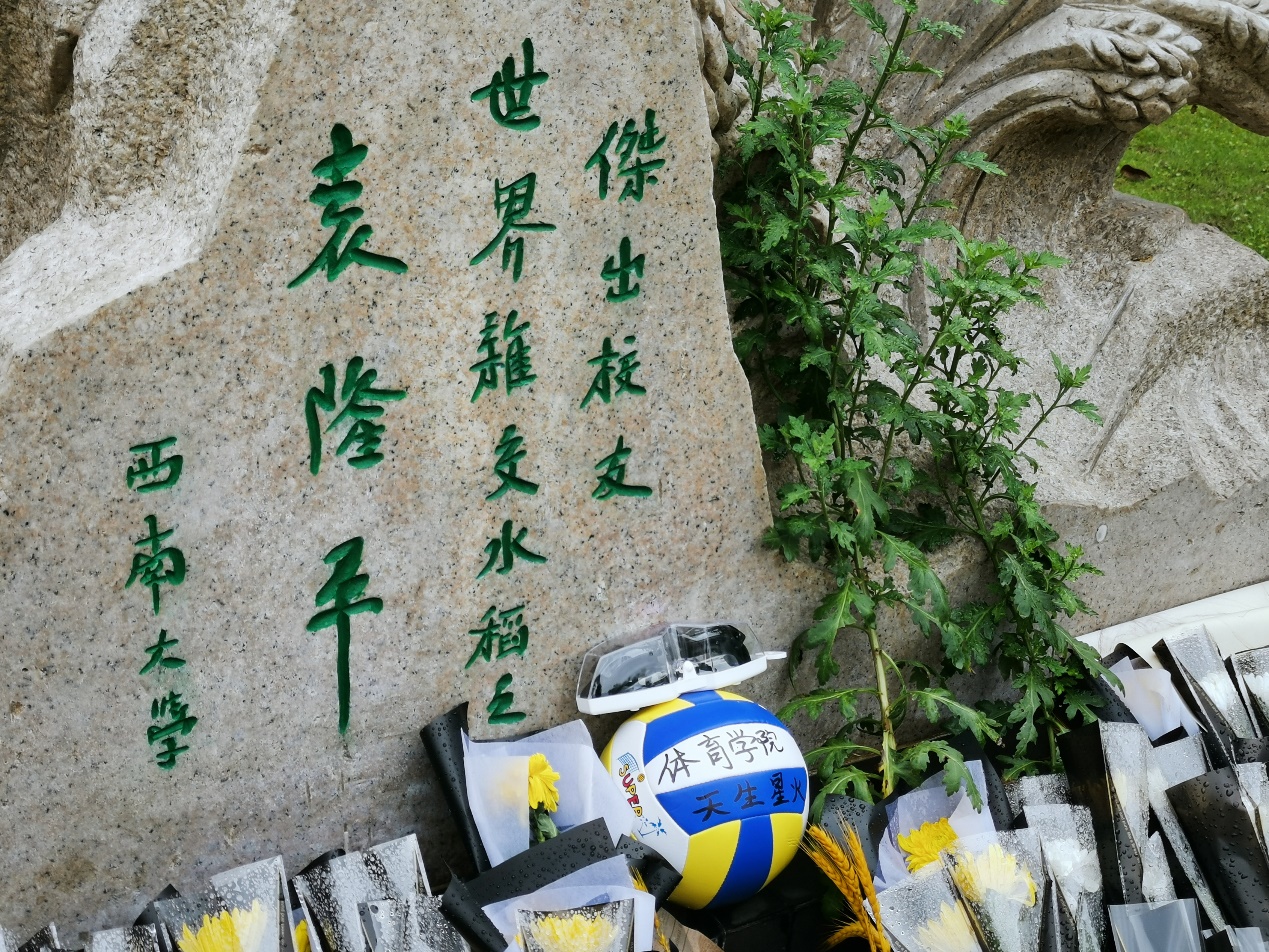 沾满雨水的鲜花丛中放了一副泳镜和一个排球,游泳和排球是袁隆平院士生前最喜欢的两项运动。体院学子用体育人的方式,对这位心怀体育报国梦,视体育运动为终身爱好的老学长表达最真诚的敬意。