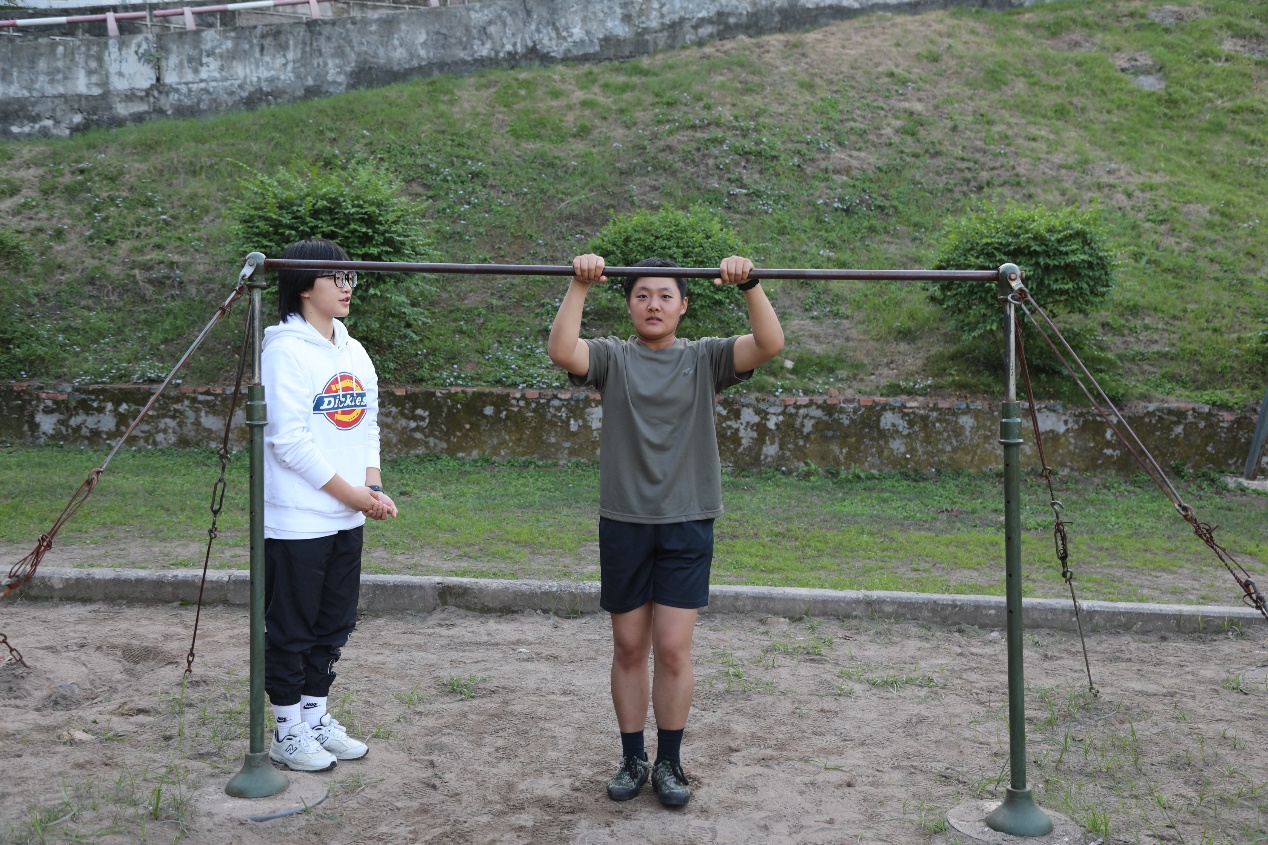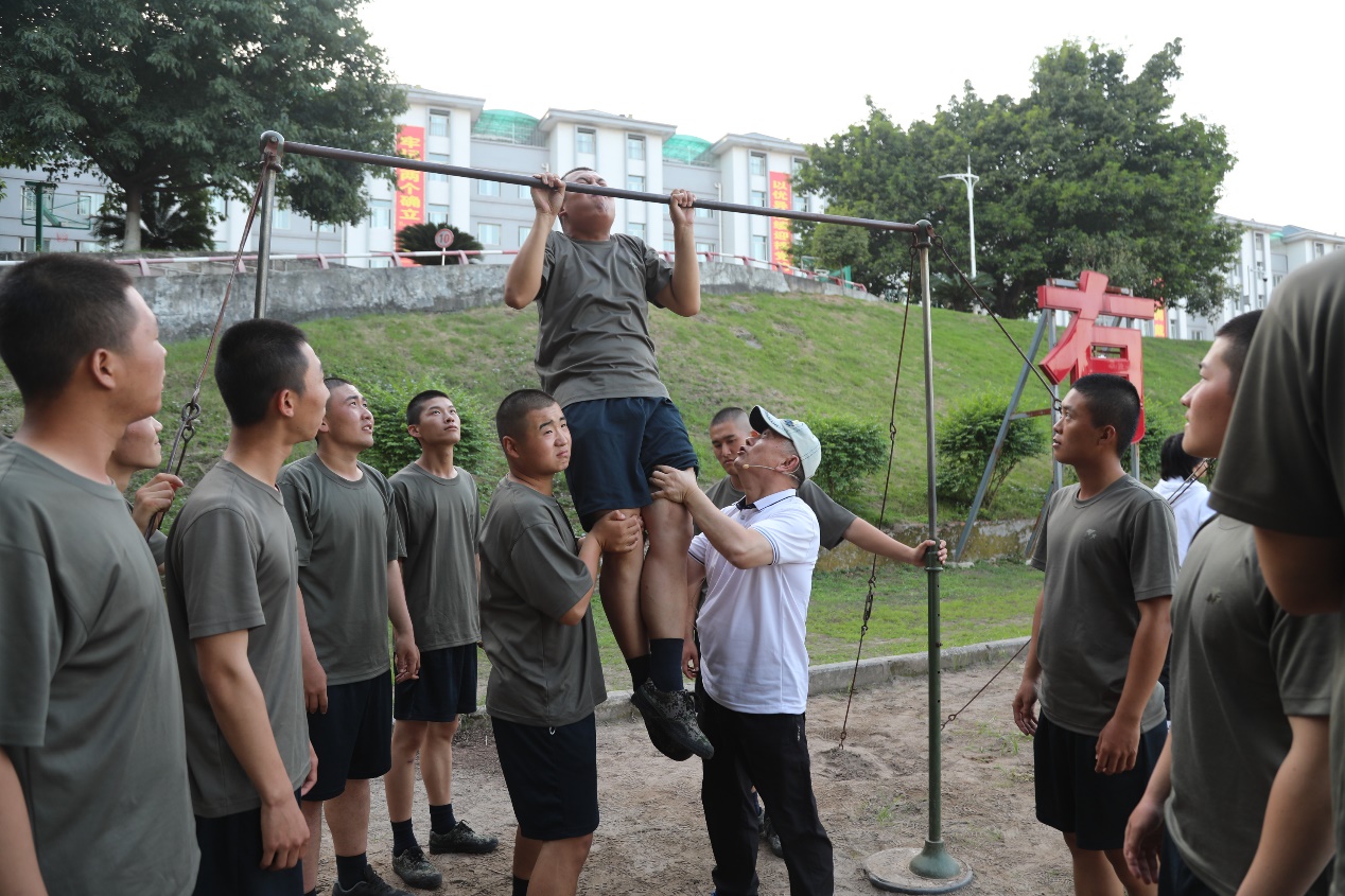 体操专项彭远志老师则针对官兵体能考核中单双杠项目,分享自身多年执教经验,将课堂教学与军事科目训练相结合,对官兵存在的问题进行专门指导,体操专业的学生配合进行动作示范与训练辅助。