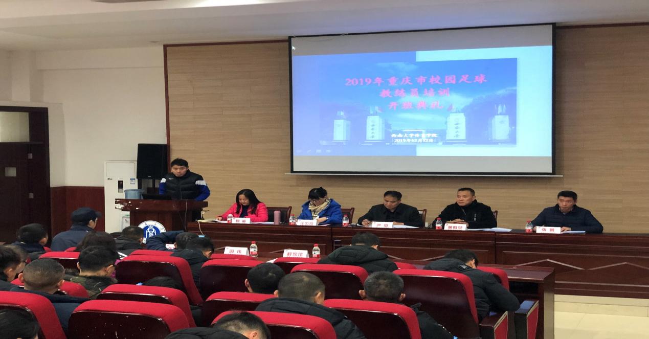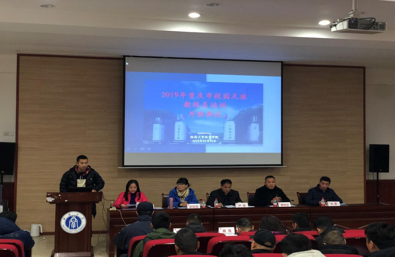 2019年重庆市校园足球教练员培训班(第一期)开班典礼在西南大学体育学院多媒体会议室举行。重庆市教委体卫艺处副处长严平、主任科员任贞铃、干部张鹏、西南大学体育学院副院长、博士生导师黄晓灵教授、培训中心主任同英、体育学院周伟老师、程家伟老师、张庭然老师、庄岩老师等领导专家出席,西南大学体育学院培训中心同英主任主持开班典礼。