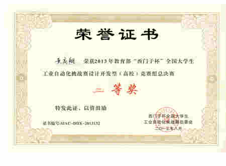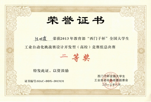 8月22日,为期四天的2013年“西门子杯”全国大学生工业自动化挑战赛总决赛在上海应用技术学院奉贤校区圆满落幕。我院代表学校首次组队参赛的“腾飞前线”队(队员:黄高翔、张伟亮,指导教师:陈明霞)进入总决赛并取得了“设计开发组(高校)”竞赛组二等奖的好成绩,填补了我校在该项赛事中的空白。