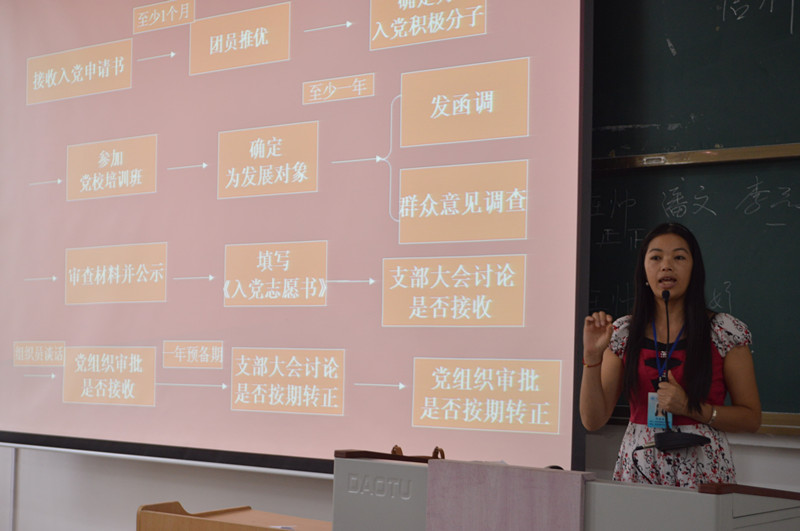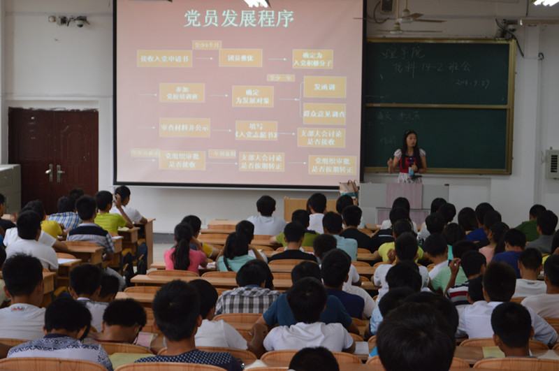 邓副书记首先对新生进行了党的基本知识教育,通过精心准备的幻灯片,围绕“如何入党”这一问题,详细介绍了发展党员工作的方针和原则、入党的程序和要求,并针对新生常见的关于入党的问题做了详细解释,让广大积极要求进步的新生对党组织有了初步的了解,对党员组织生活充满了向往。邓副书记通过对党史、校史的讲述,增进新生对党和学校的了解和感情,激发他们的政治热情,帮助他们逐步树立起自愿为共产主义事业奋斗终身的信念,提高对党的认识,自觉向党组织靠拢。