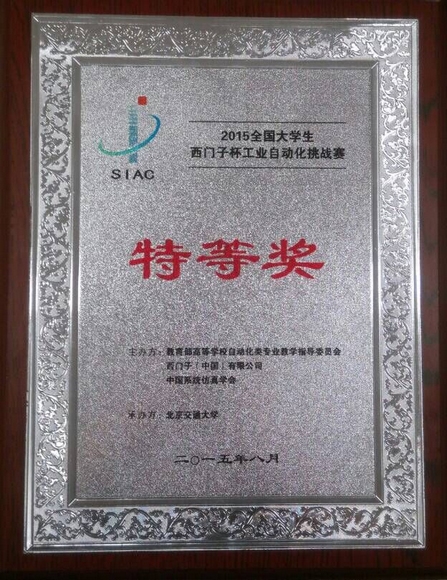 8月25日,2015年全国大学生“西门子杯”工业自动化挑战赛总决赛在北京交通大学圆满落幕。经过紧张激烈的角逐,我校学子取得了高校组的“设计开发”特等奖(“蒸蒸日上”队,学生:丁清澍、余永洋,指导教师:赵虹),“逻辑控制”二等奖(“北门飞雁”队,学生:阳云峰、邱盛云,指导教师:李海侠),以及“运动控制”二等奖(“rock_king”队,学生:罗勤峰、陈庆,指导教师:杨桂华)各1项的好成绩。这也是继上一届我校学子取得一等奖后取得的又一突破性佳绩。