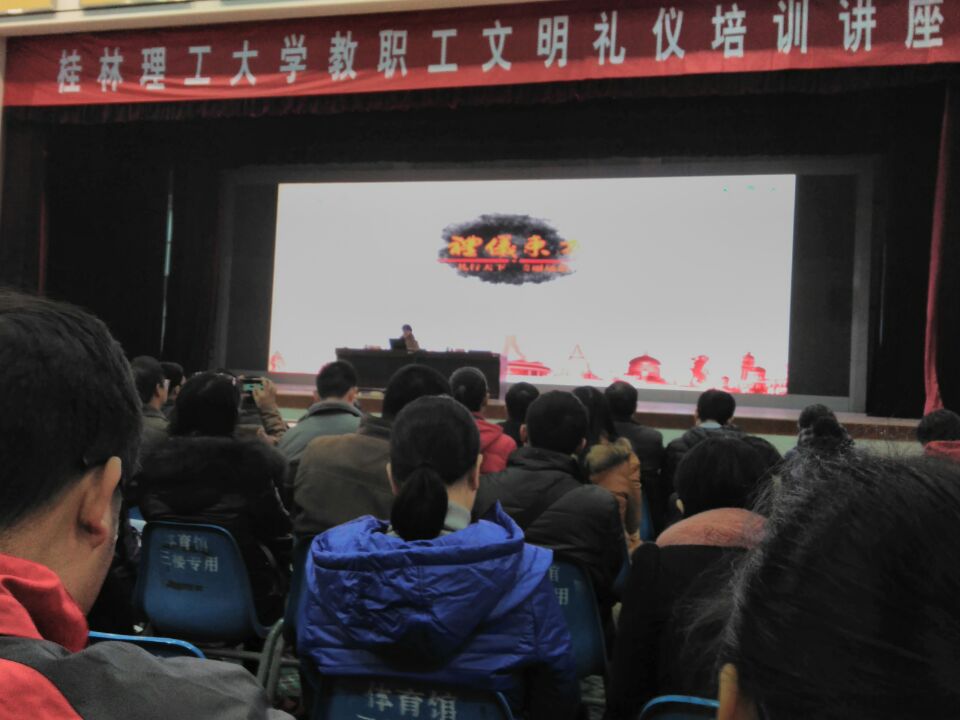 2015年12月22日下午金工中心全体教师根据学校学院文件精神,积极参加桂林理工大学教职工文明礼仪培训讲座听课,更加的提高了教师的文明礼仪知识。
