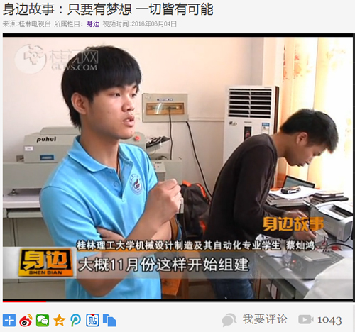 桂林电视台《身边》栏目《身边故事:只要有梦想,一切皆有可能》视频链接网址:http://tv.gltvs.com/201606/2016060421110638f2f72cc9704fdd.shtml
