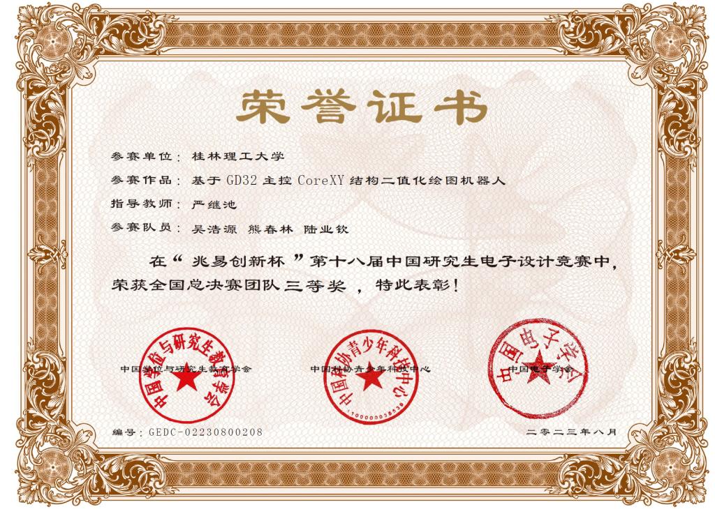 2023年8月10至13日,“兆易创新杯”第十八届中国研究生电子设计竞赛全国总决赛在东莞理工学院举行。本届赛事共有来自330余所高校及科研院所的6289支队伍参赛,经过全国八大赛区初赛与复赛的评审选拔,520余支队伍从各自所在赛区脱颖而出,晋级全国总决赛。最终我校参赛队伍由机械与控制工程学院严继池老师指导学生吴浩源、熊春林、陆业钦参赛的“基于GD32主控CoreXY结构二值化绘图机器人”作品荣获全国总决赛三等奖。
