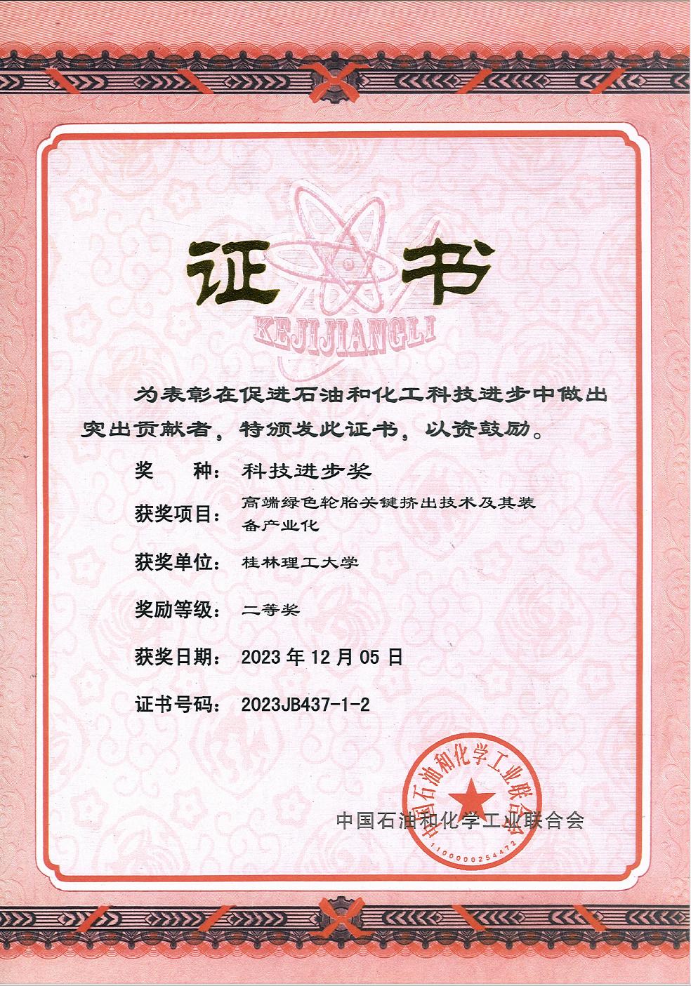 学院黄发国教授、潘家芳教授作为主要参与人,学校作为第二完成单位与桂林橡胶设计院有限公司联合申报的“高端绿色轮胎关键挤出技术及其装备产业化”项目获得中国石油和化学工业联合会科技进步二等奖。