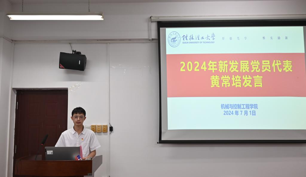 机械2020-2班本科生黄常培代表2024年新发展党员进行发言。他号召全体学生党员加强理论学习,提高政治素养;加强党性锻炼,树立良好形象;积极投身实践,服务人民群众;勇于创新创造,推动社会发展,时刻牢记自己的党员身份,争做做有理想、敢担当、能吃苦、肯奋斗的新时代青年,在实现民族复兴的伟大实践中放飞青春梦想,在全面建设社会主义现代化国家的光荣征程中实现人生价值。