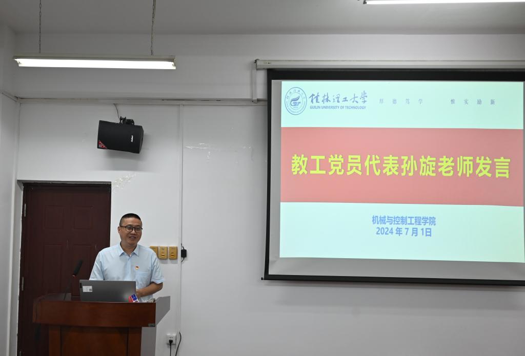 接着,学院党龄最长的孙旋老师代表教工党员进行发言。他深情的回顾了自己的入党初心,分享了家乡独臂将军贺炳焱传奇故事和自己从入党至今在不同工作岗位的成长与发展、收获和感悟,言语间无不透露出一名共产党员忠诚于党的教育事业、奋力推动教育事业发展的强烈的责任心和使命感。他号召学院全体教工党员弘扬教育家精神,充分发挥共产党员的模范带头作用,牢记立德树人使命,为培养能担当社会主义建设大任的时代新人贡献力量。