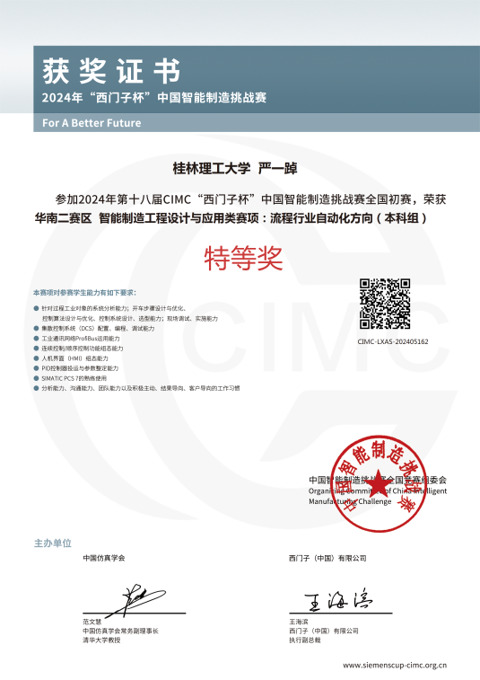 教育部2024年第十八届CIMC“西门子杯”中国智能制造挑战赛各赛项已于暑期在全国各分赛区陆续进行。在本届大赛中,我院教师陈明霞指导的由我院本科生周家鑫、研究生严一踔组成的参赛队伍获得了智能制造工程设计与应用类赛项:流程行业自动化方向(本科组)的分赛区特等奖,另还有5支参赛队获得不同赛项的分赛区一等奖1项、分赛区二等奖2项、分赛区三等奖2项。