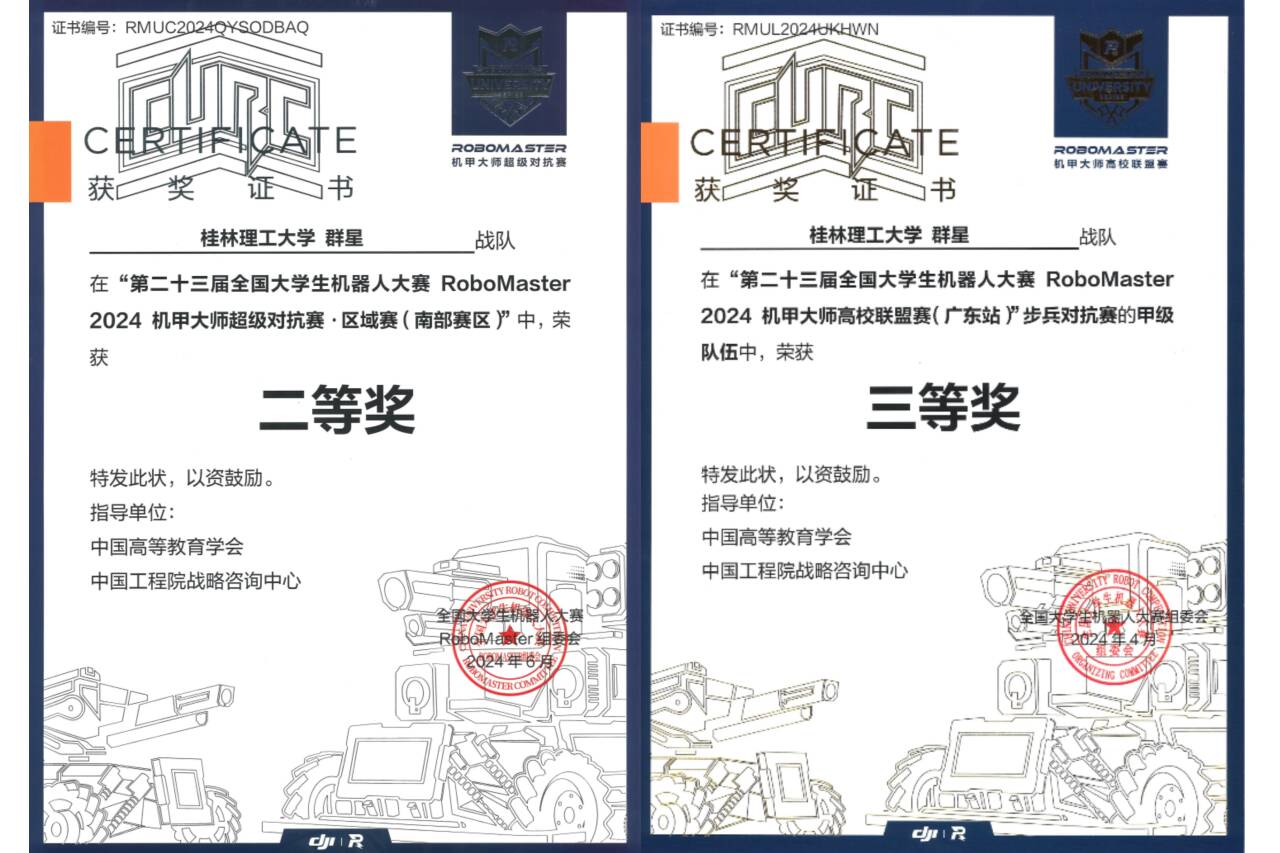 近日,由大疆公司主办的“第二十四届全国大学生机器人大赛RoboMaster2024机甲大师高校联盟赛”与“第二十四届全国大学生机器人大赛RoboMaster2024机甲大师超级对抗赛”圆满结束。桂林理工大学机械与控制工程学院的群星战队在此次比赛中表现出色,荣获多项殊荣,再次展示了桂林理工大学在机器人技术研发和竞赛领域的卓越实力。