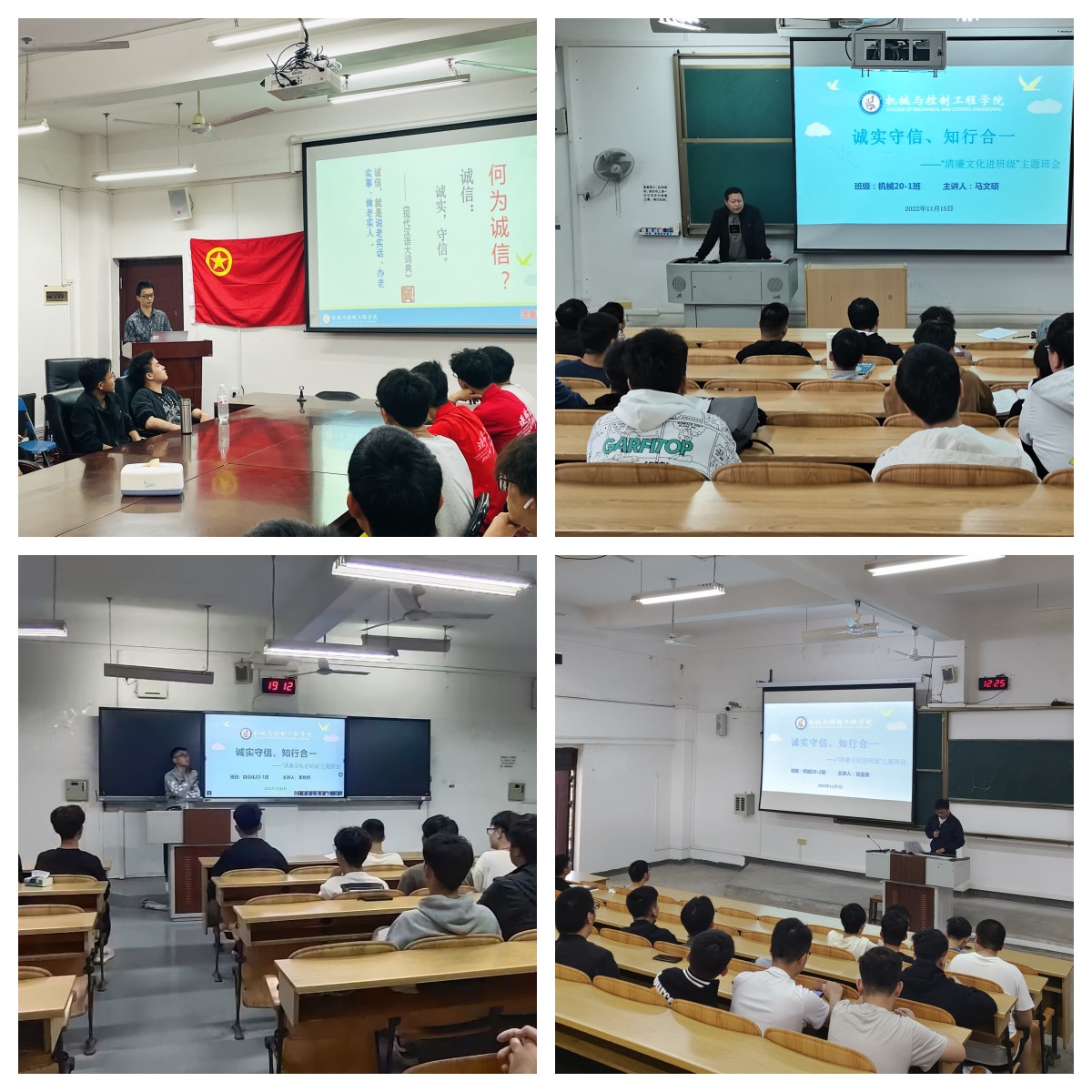 为进一步推进清廉班级建设,将清廉文化、诚信文化融入班级建设,打造学风优良的班级,实现学生崇尚清廉、成才有为,6月3日-6日期间,机械与控制工程学院组织全院所有班级以“廉洁文化班级”——诚实守信,知行合一为主题,同上一堂主题班会课。
