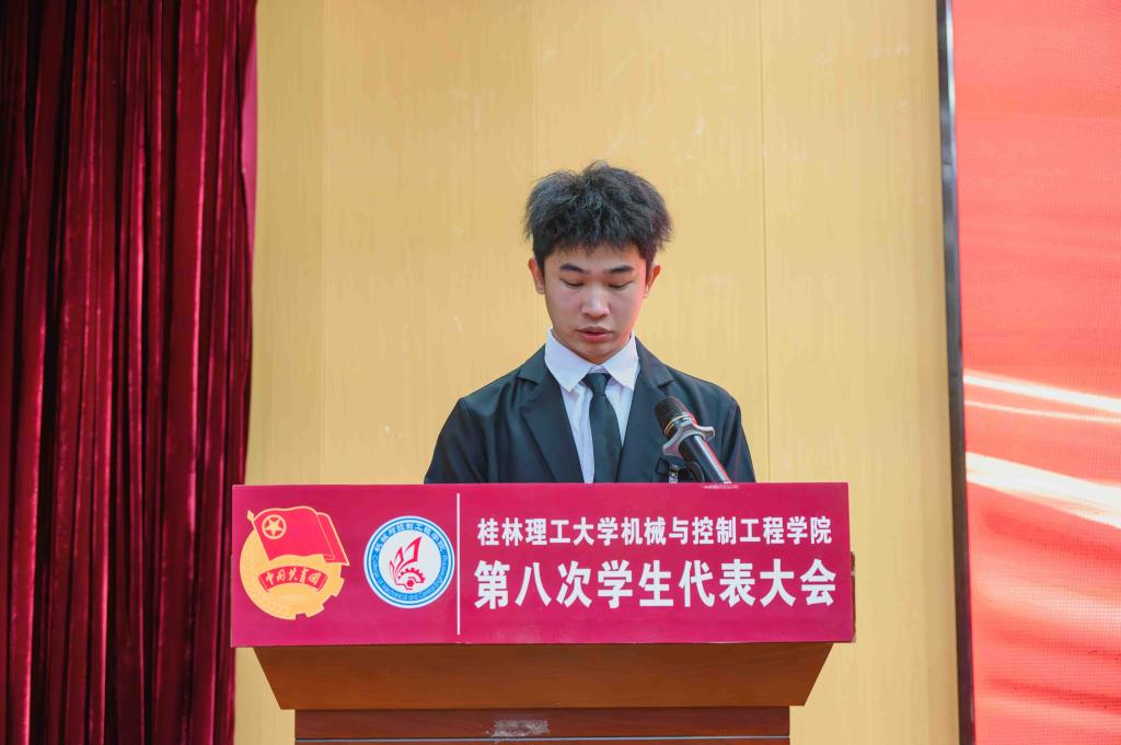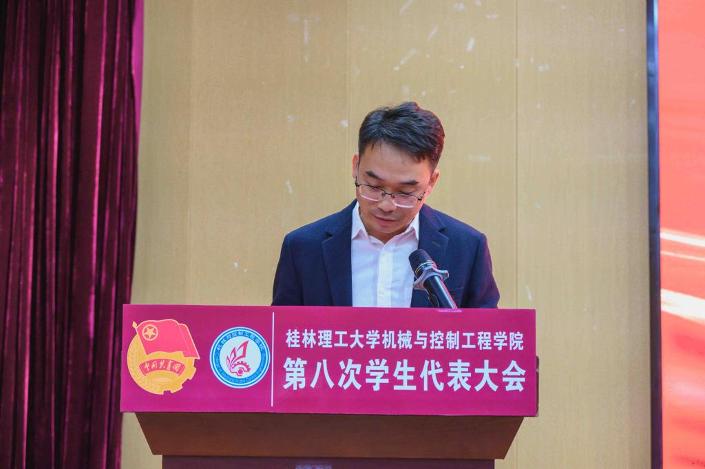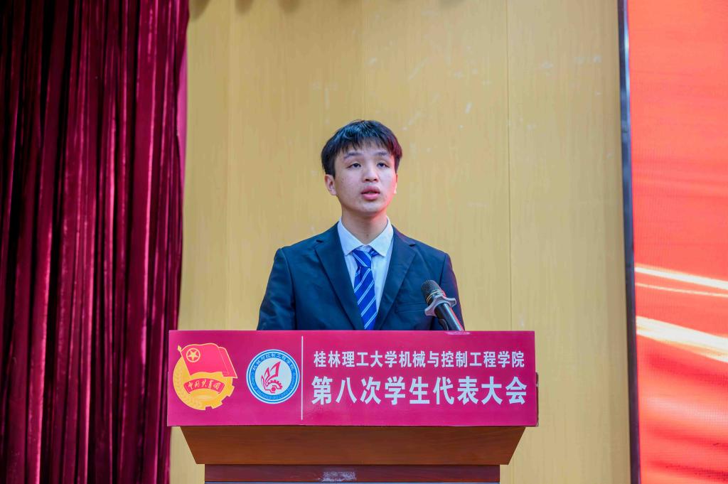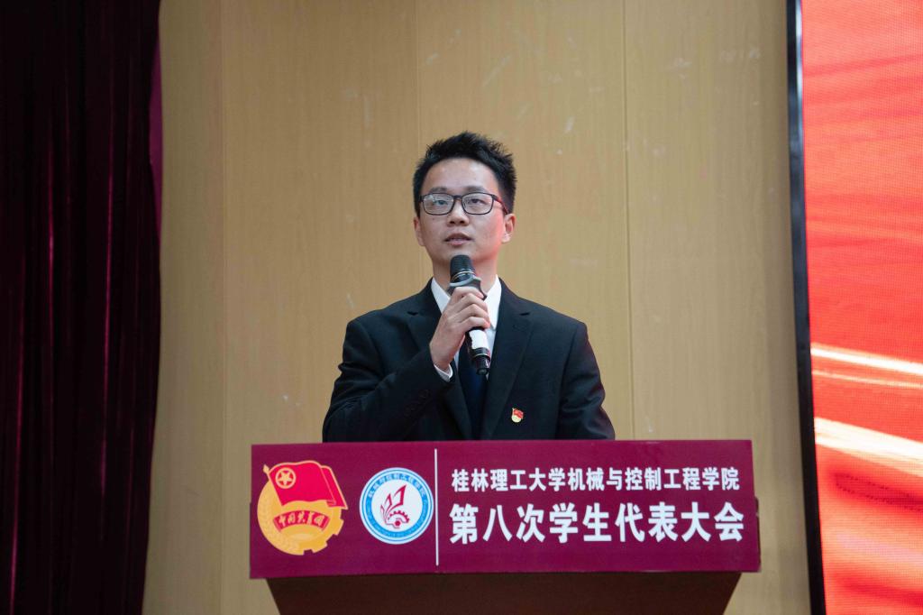为着力发挥学院团委思想引领作用,不断强化提升青年学生政治性、先进性,2024年12月27日,机械与控制工程学院第八次学生代表大会在雁山校区图书馆报告厅召开。学院党委书记耿俊茂、学校创新创业学院副院长唐红兵、学院党委副书记王迎波、副院长代宣军、团委书记黎云鹏、团委副书记刘威、校学生会代表黄天池、机控学院全体师生代表参与本次会议。大会由学院第七届学生会执行主席古振华同学主持。