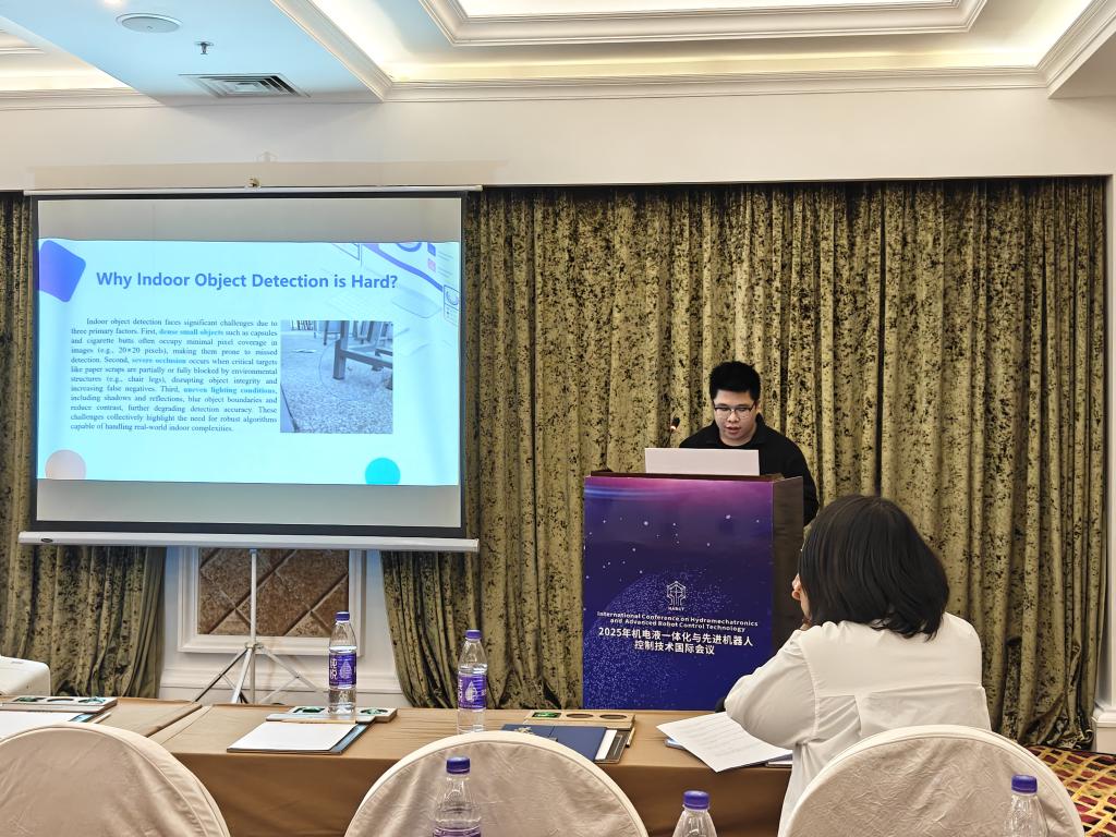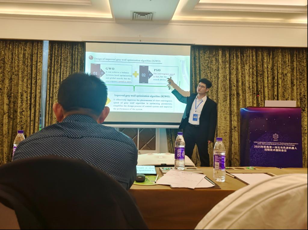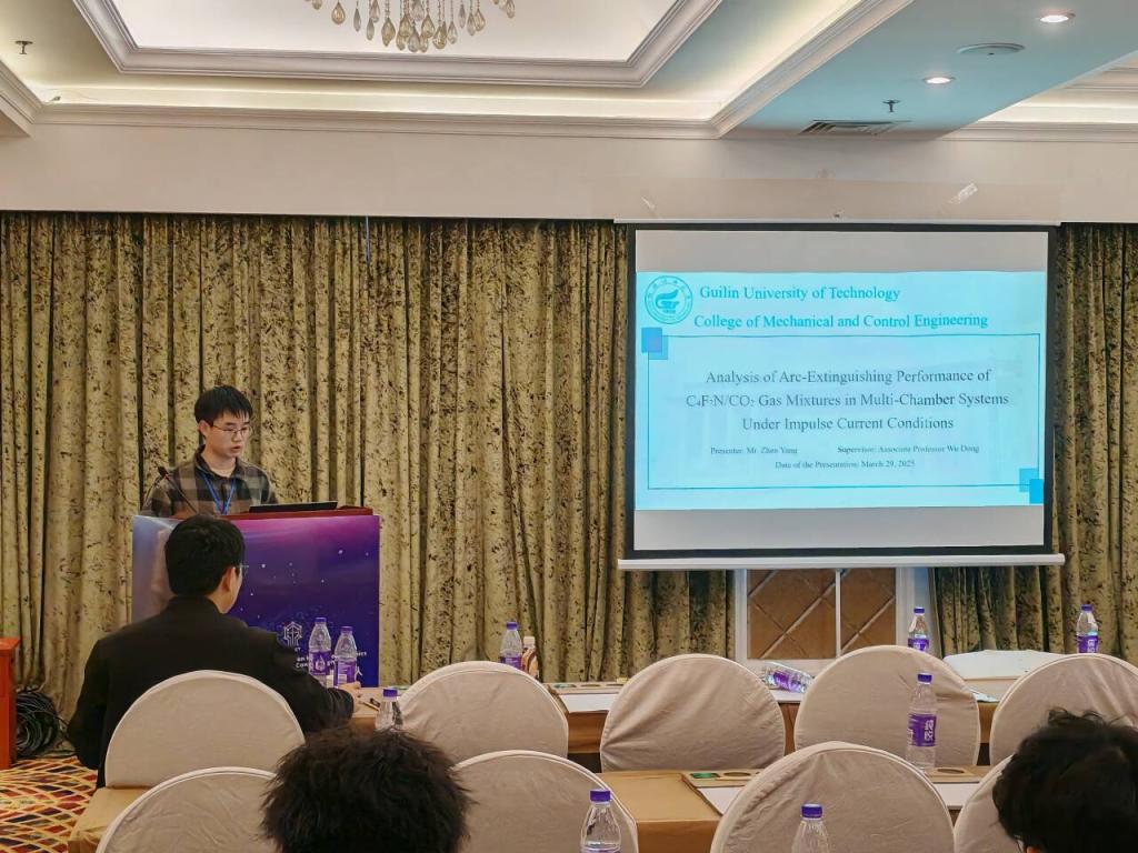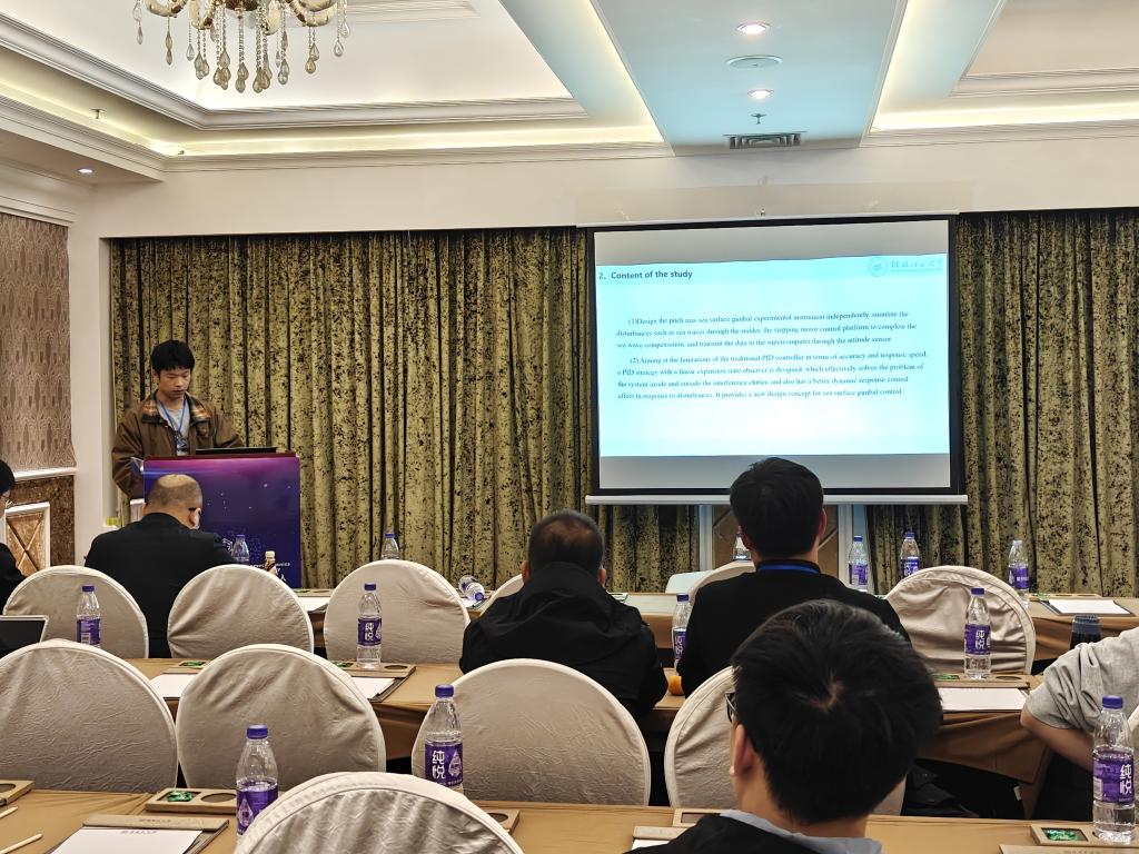 29日下午的分会场学术汇报中,我院教师孙旋以及5名硕士研究生通过技术创新与工程实践的结合,展现了他们在学科交叉领域的探索活力。孙旋以《Multi-objective Optimization Design of the Hinge Sleeve of Cubic》为题,分享了立方体铰链套的多目标优化设计方法,为复杂机械结构的轻量化设计提供了新思路;机械工程专业研究生李有兵作了题为《Decoupling Control of Electromagnetic Bearing Rigid Rotor System Based on IGWO and Linear Active Disturbance Rejection Inverse System》的报告,提出了一种新型复合的控制策略应用在电磁轴承系统中;电子信息专业研究生李纪臻作了题为《Research on sea surface Gimbal Control Strategy Based on LESO Observation PID》的报告,提出了海洋环境下云台姿态稳定控制新方法;电子信息专业研究生张佳强作了题为《Improved YOLOv8 Algorithm for Indoor Object Detection》的报告,分享了强化学习在工业机器人领域的应用突破;电子信息专业研究生杨振作了题为《Analysis of Arc-Extinguishing Performance of C4F7N/CO2 Gas Mixtures in Multi-Chamber Systems Under Impulse Current Conditions》的报告,为高压电力装备的绝缘介质选择提供关键实验依据。电子信息专业研究生张宝桐作了题为《Improved YOLOv8 Algorithm for Indoor Object Detection》的报告,为服务机器人环境感知提供了新思路。