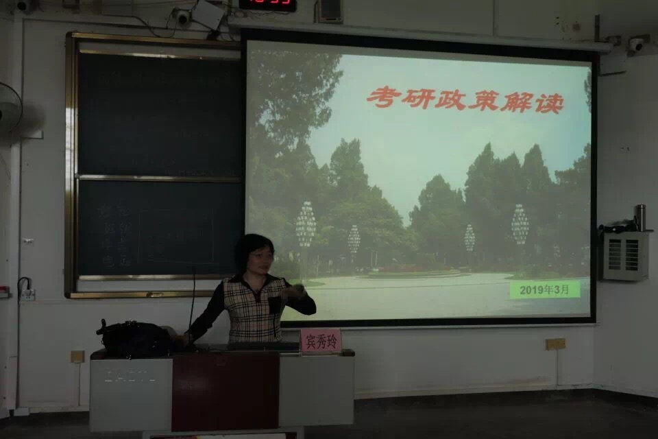 随后,宾秀玲老师从两个方面做了精彩细致的讲座。一是从为什么考研、考研的意义展开,为同学们分析了考研的形势与动态,鼓励同学们选择考研为将来更好的就业打下基础。二是从研究生专业与学制、国家政策与校园政策、报考与录取流程等方面进行了讲解与辅导,同时向同学们传授了有关考研初试和复试的宝贵经验。
