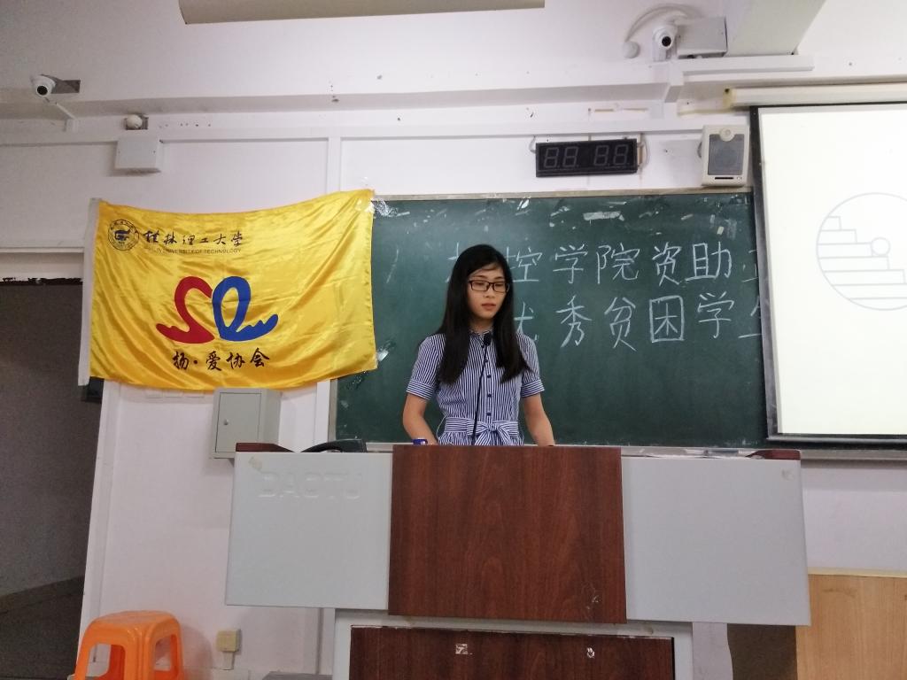 首先,刘金良老师对本次活动致辞,说明本次活动的目的与意义,希望同学们能怀有一颗感恩的心,勇敢在大学追逐自己的梦想,实现人生价值。接着,刘金良老师给本次资助月征文比赛获奖同学进行颁奖,扬•爱协会会长韦武谭给学院自强之星和公益摄影大赛进行了颁奖。最后,学院优秀贫困生代表曾德政、韦雄棉、王舟等同学进行报告,分享大学的学习、工作、科技竞赛、考研、生活等方面的经验,鼓励大家一起进步,不断提升自己,让自己越来越优秀,让自己的大学生活绽放光彩。