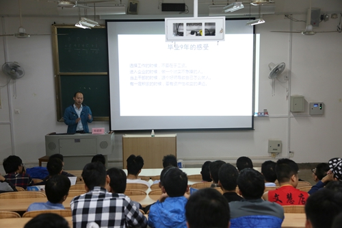 首先,杨建新学长为同学们讲解了毕业后九年内的感受,分析了毕业九年来职业工作的变化。随后,杨建新学长就怎样做好职业选择让同学在将来的日子里面思考“什么是好工作,自己想要什么,未来成为怎样的人”这三个问题,同时希望同学们要理解社会的现实,不要好高骛远,要从基础做起,做好自己。最后,杨建新学长希望在场同学们要增强自己的学习能力,扩大自己的逻辑思维能力,作为一个大学生要心存梦想,敢于追求,为提高自己价值努力奋斗,在校期间要学好专业技能,为自己的将来打好基础。