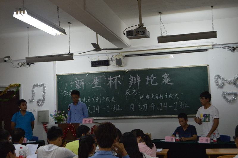 第一场是机械14-1班与自动化14-1班以分别以“顺境、逆境哪个更有利于成长”为题展开较量,首先正方代表队机械1班一辩以“顺境对成长起关键性作用”开篇立论,反方自动化1班则以“你竟能培养生活能力”引出反方观点,接下来的攻辩环节中,双方引经据典,你来我往唇枪舌战,,一度将比赛推向高潮,博得了现场的阵阵掌声,辩手们精彩的表现之后,评委们评定反方获得本场辩论赛的胜利,反方四辩施文文收获了最佳辩手称号。