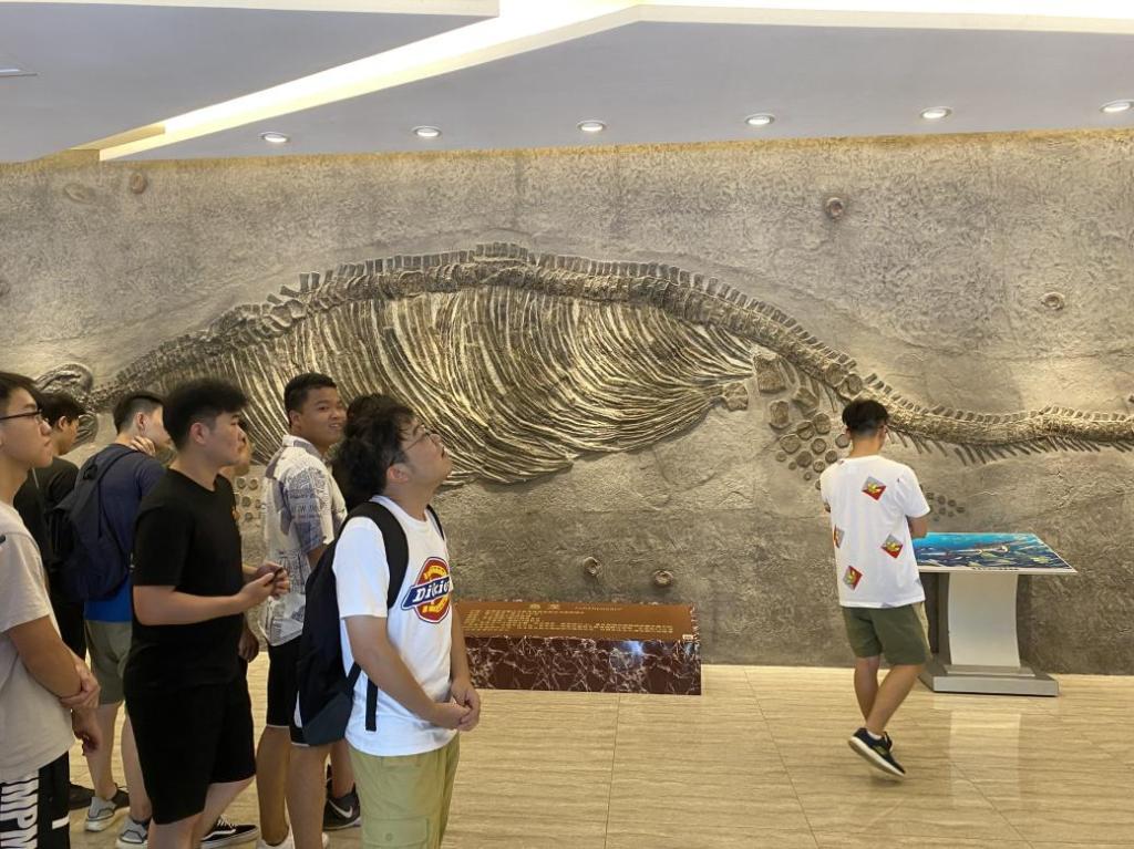 在现场讲解员的带领下,同学们首先参观了各种古生物化石、矿物、岩石、矿石和宝玉石等珍贵标本5000余件,包括长13 m产于贵州关岭的鱼龙化石、重3.5 t的南丹铁陨石、丰富的有色金属矿石及来自南极的岩石标本等。对被誉为“地质历史活的教科书”的金钉子国际地层剖面、天外来客“陨石”、独特的喀斯特岩溶地貌、世界超大型矿床“大厂锡多金属矿”和“平果铝土矿”等专题进行了深入剖析与系统展示。