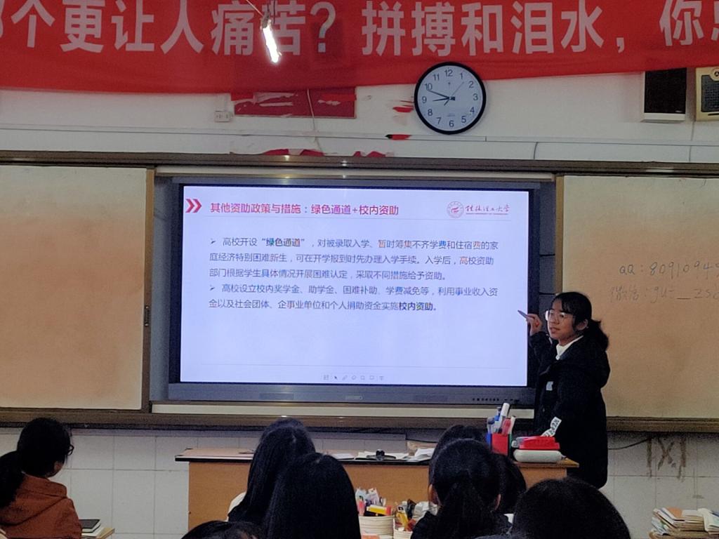 为深入学习宣传贯彻习近平新时代中国特色社会主义思想和党的十九大精神,为广泛引领学生在社会实践中受教育、长才干、作贡献,同时为加大学校招生宣传和高校国家资助政策宣传的力度,提高学校的知名度,给学校带来更好的生源。桂林理工大学机械与控制工程学院李文权同学积极响应学校“感恩母校行,共筑成长梦”寒假社会实践活动,组建了“富川高级中学招生宣传社会实践团”前往富川县高级中学开展宣讲活动。本次活动通过团队成员向高中母校学生介绍并展示在大学期间的学习和生活,并结合个人实际情况帮助他们更直观、更全面、更深入地了解学校概况、专业设置、办学特色、校园文化、思想教育、资助政策等方面的内容。