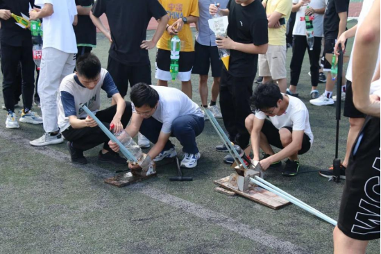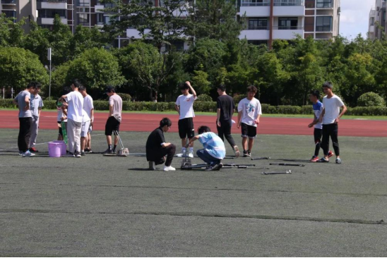万事俱备,只欠东风。在经过一段时间的等待后,比赛正式开始了。所有参赛选手都蓄势待发,跃跃欲试。参赛人员要将水火箭飞出至少40米远。一支队伍一马当先,首次发射便飞出61米的好成绩。他们的成功彻底点燃了选手们热情,越来越多的选手加入并乐在其中。