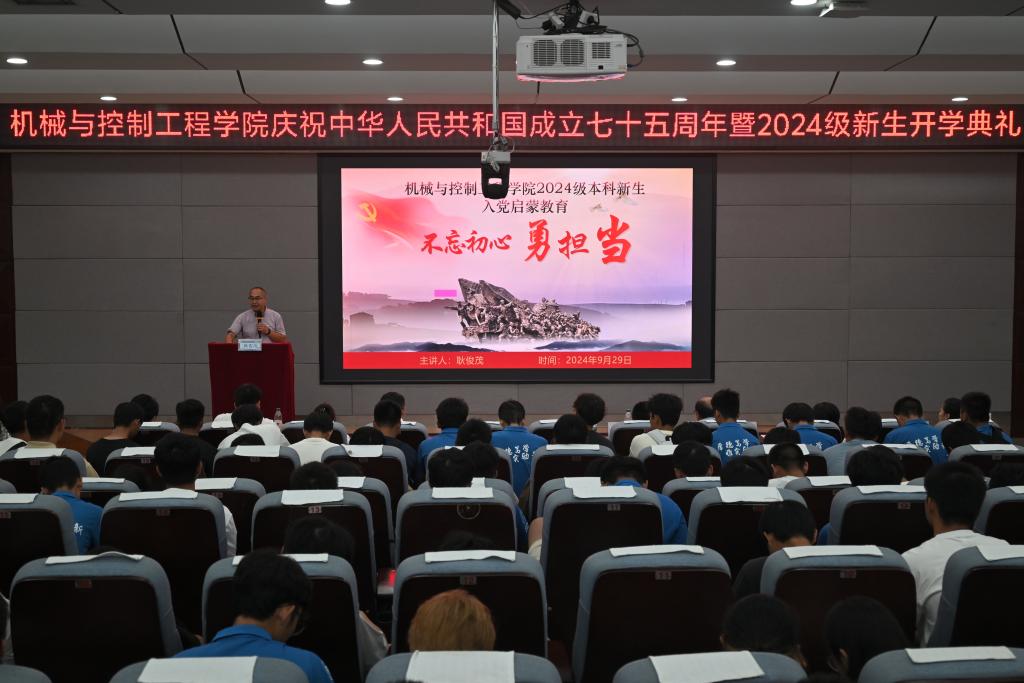 金秋九月,青春飞扬。机械与控制工程学院9月29日在学校01501报告厅针对机械类专业、自动化类专业,9月30日在学院07209会议室,针对MMU专业,开展庆祝中华人民共和国成立七十五周年暨2024级新生开学典礼。学院党委书记耿俊茂、国际教育学院院长、国际交流处处长全克林、学院领导、实验室主任、教师代表、学院老生代表和2024级全体新生参加典礼,典礼由学院党委副书记王迎波主持。