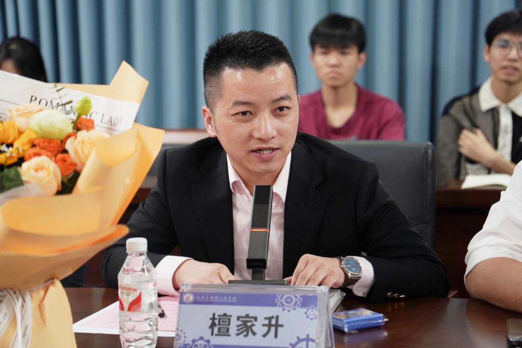 校友代表檀家升发言,首先他对学院的培养和老师们的辛勤付出表示感谢,随后,他结合自己的在校求学与毕业后的工作经验和个人感悟,与同学们强调了三点,一是学习为本,勤勉为先。学习永远是学生的主业。在校期间,要珍惜每一次学习的机会,深入钻研专业知识,不断提升自己的综合素质。要学生要以学习为主,扎实学识