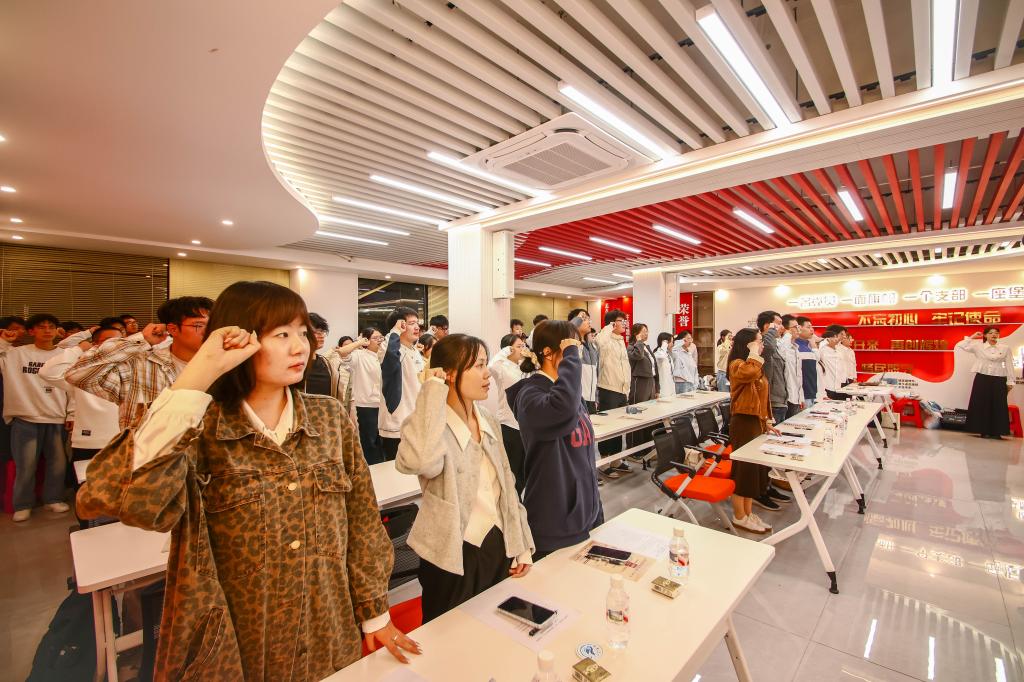 活动尾声,团员青年合唱校歌《桂林理工大学之歌》。“七星叠翠,漓水流长,屏风紫气蔚霞光……”嘹亮的歌声中,爱校之情与报国之志交织成澎湃的乐章。随后,大家面向团旗庄严宣誓,重温入团誓词。铿锵有力的誓言,是青春的承诺,更是奋进的号角。