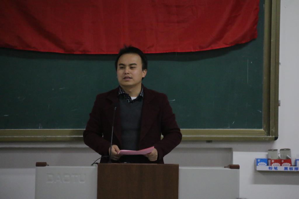 启动仪式在庄严的国歌中拉开帷幕。随后,学院党务中心主任黎云鹏老师详细介绍了此次主题党日活动的方案,同时对主题党日活动的开展提出了要求与希望:一是所有党员不仅要积极了解、学习中华优秀传统文化,而且需要用实际行动去传承弘扬传统文化;二是要把学习践行中华优秀传统文化与学习贯彻党的十九大精神、推进“两学一做”学习教育常态化制度化相结合,切实学深、弄懂、悟透、践行中华文化;三是把学习践行中华优秀传统文化与“学在桂工”学习教育相结合,广大党员要切实发挥先锋模范带头作用,在学风建设中勇立潮头,做到“聚是一团火,散是满天星”。最后,黎老师祝我院12月主题党日活动在全体党员的努力下取得圆满成功!
