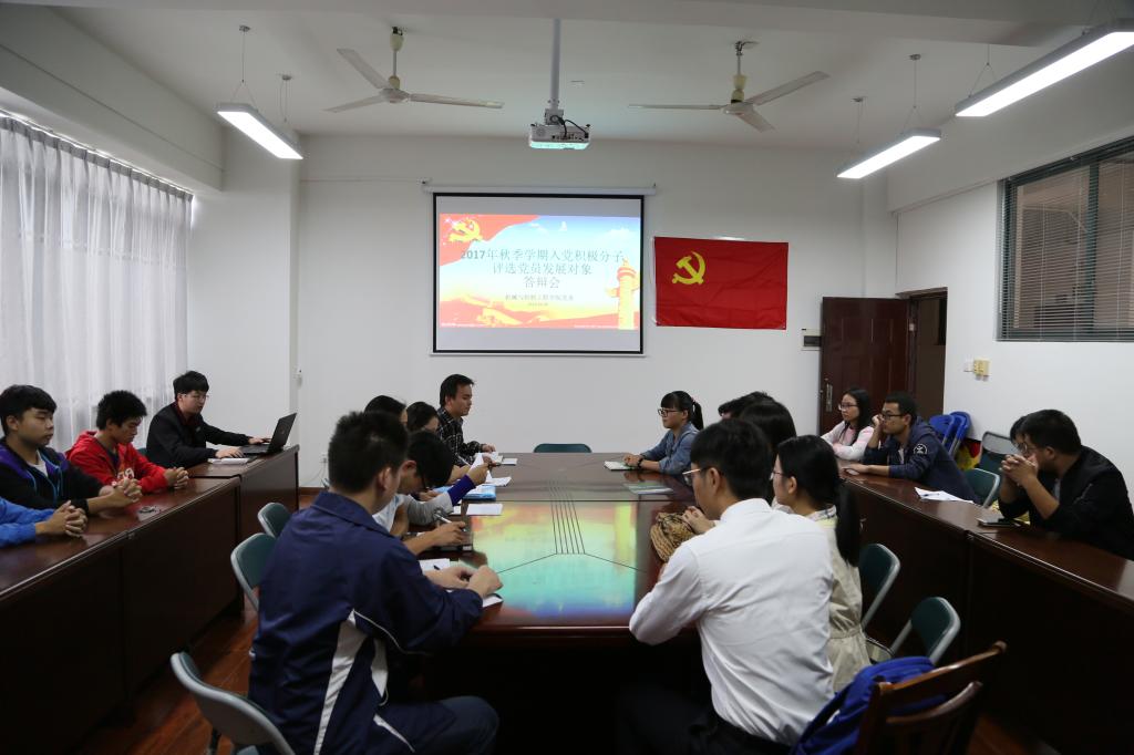 为深入推进我院“两学一做”学习教育制度化常态化,贯彻落实党的十九大精神,加强党员队伍建设,提高党员发展对象的整体水平和素质,强化入党前的教育、考察和监督,增强党员发展工作的透明度、认可度和党组织的凝聚力,10月20日下午,我院在07209会议室举办党员发展对象评选答辩会,我院党委副书记邓洁琼、党建办负责人以及各支部书记担任本次答辩会评委。答辩会由我院党建辅导员黎云鹏老师主持。