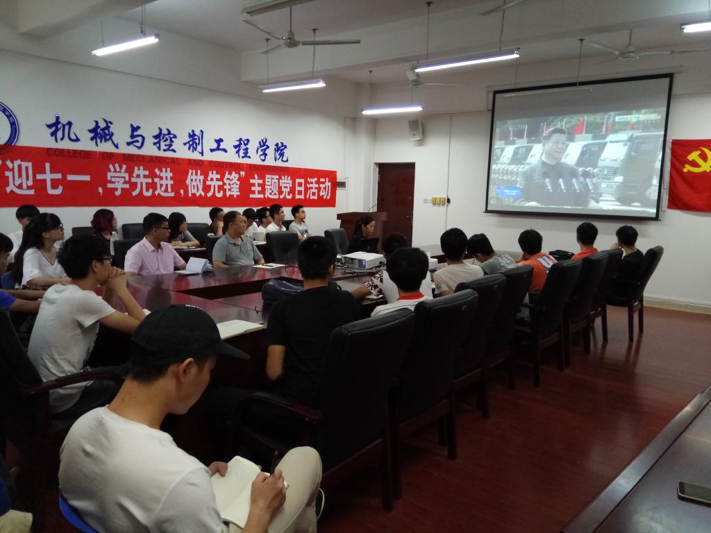 为庆祝中国共产党成立96周年和香港特别行政区成立20周年,扎实推进“两学一做”学习教育常态化制度化,7月1日上午,机械与控制工程学院党委组织广大学生党员在07215和08113举办了一场“迎七一,学先进,做先锋”的主题党日活动。学院党委副书记邓洁琼、学院副院长钟志贤、机械工程实验室老师陈辉庆、学院党建辅导员黎云鹏以及在校学生党员50多人参加了党日活动。活动由黎云鹏老师主持。