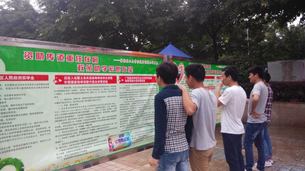 活动当天,我院党员志愿者为活动在学生社区悬挂了“政策助学,学子圆梦,诚信你我,感恩社会”,“贫寒学子求知路,奖助学金来帮助”的横幅。在活动现场,展示了我院党员制作的“资助传道重任在肩,政策助学宏愿在望”宣传展板,同时,党员志愿者耐心地向我校广大师生发放了“广西高校资助政策体系”宣传单,以图文并茂的方式向大家生动形象展示了学生资助政策的对象、标准、流程等内容,使资助政策知识更加深入人心。在“恪守诚信,感恩助学,言行一致,节俭奉献”的横幅上,我院教工党员与广大受助学生一起,郑重地签下了自己的诚信感言和姓名。同学们纷纷表示,感谢国家资助政策,今后必将发奋学习,感恩奉献,做一名诚信文明、自强不息的当代大学生。