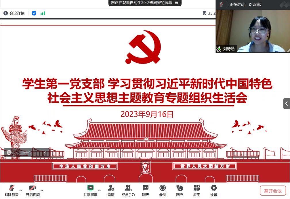 9月16日晚,学生第一党支部召开学习贯彻习近平新时代中国特色社会主义思想主题教育专题组织生活会,会议采用线上形式,由支部书记王迎波主持,支部全体党员参加。