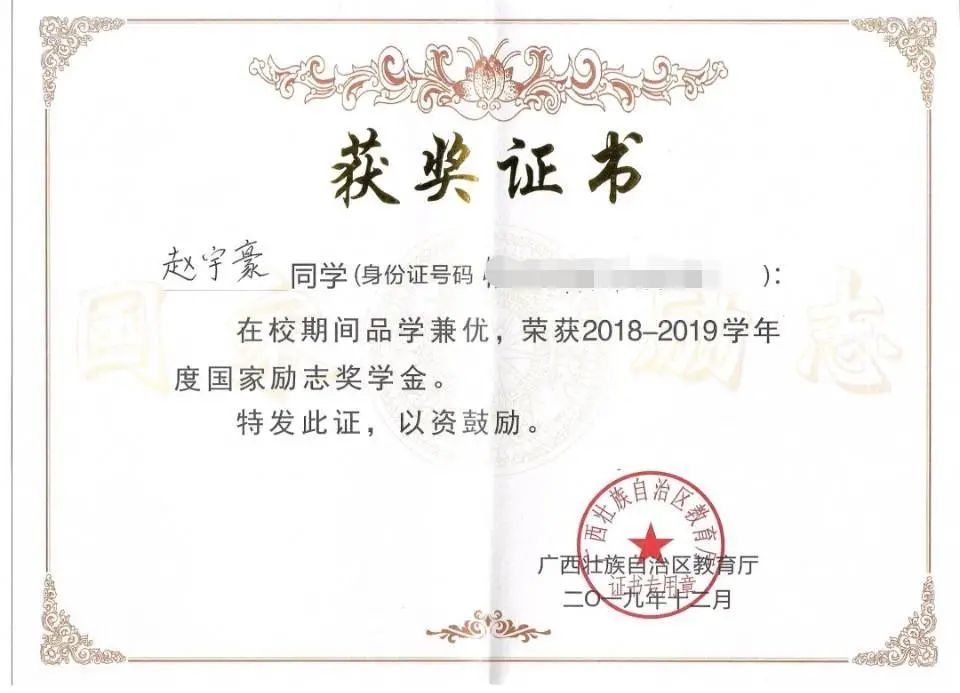 曾获国家励志奖学金三次、优秀学生奖学金特等奖一次,一等奖两次