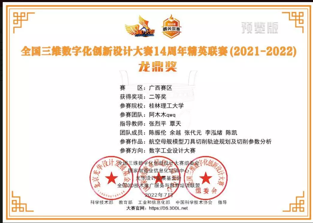 1、2022年7月,荣获全国三维数字化创新设计大赛广西赛区一等奖、二等奖、三等奖;