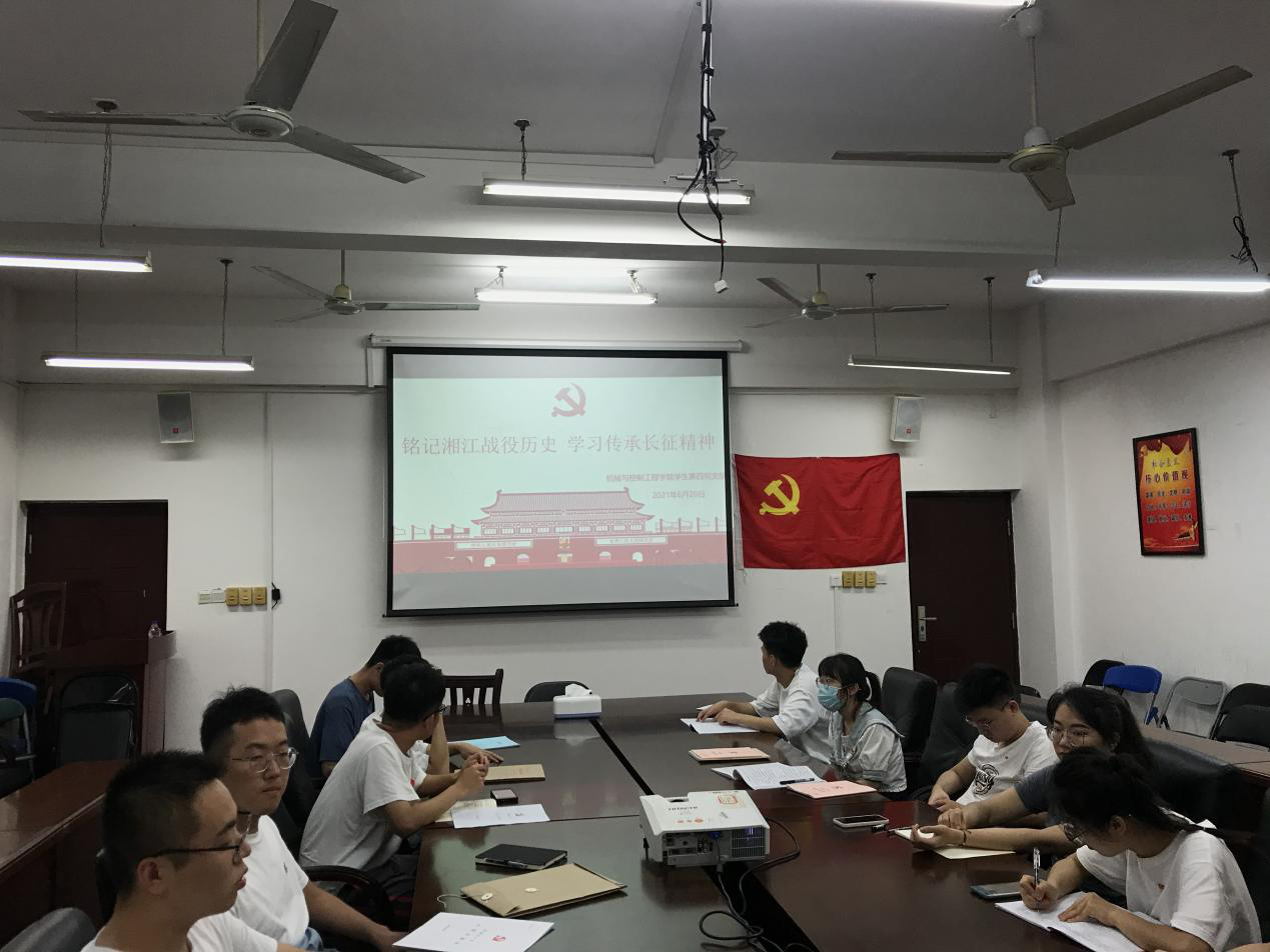 为学习贯彻落实习近平总书记考察红军长征湘江战役纪念园时的重要讲话精神,推进党史学习教育扎实开展,学生第四党支部于6月20日晚上在07215会议室开展了以“铭记湘江战役历史,学习传承长征精神”为主题的党日活动。